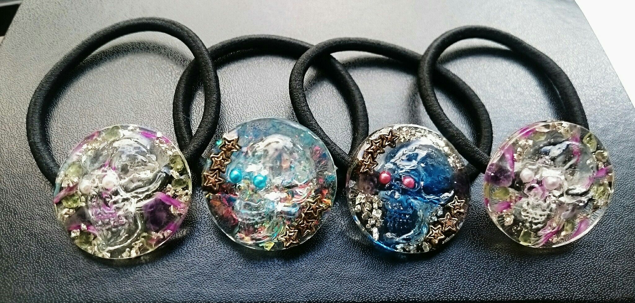 いつもご覧頂きありがとうございます ドクロちゃんのヘアゴムを作りました。千日紅ドライフラワーとさざれ石を入れたドクロちゃんが可愛くできて、ドライフラワーを入れるのが最近のお気に入りです。 4つヘアゴムが出来上がりましたが、青のドクロちゃんは表に大きな気泡ができてしまい、ドライフラワードクロちゃんの1つは周りを削るときに目のパールを削ってしまったので、自分用かお試しでお譲りしようかと思っています。 ドクロちゃんヘアゴム2点は近日中にラクマに追加しますので、またお知らせしますね