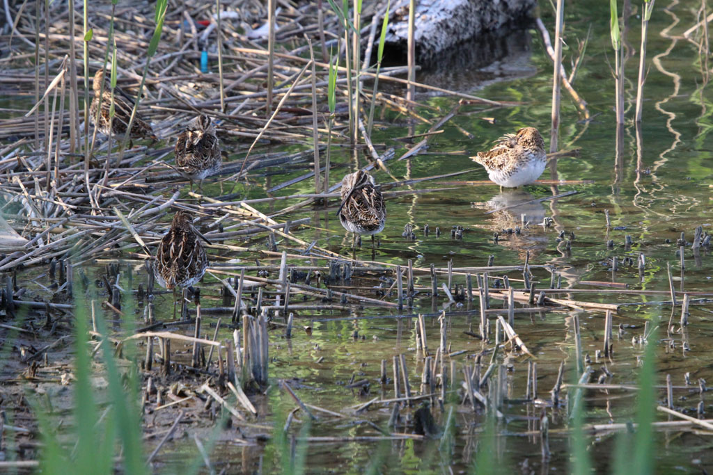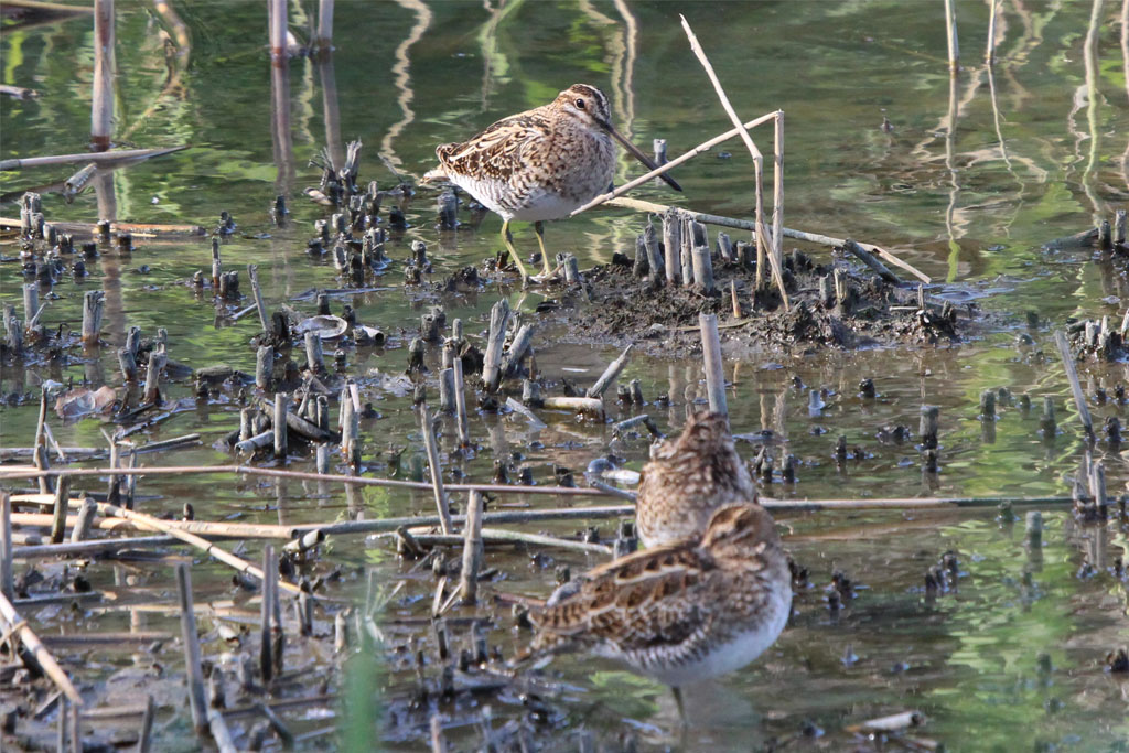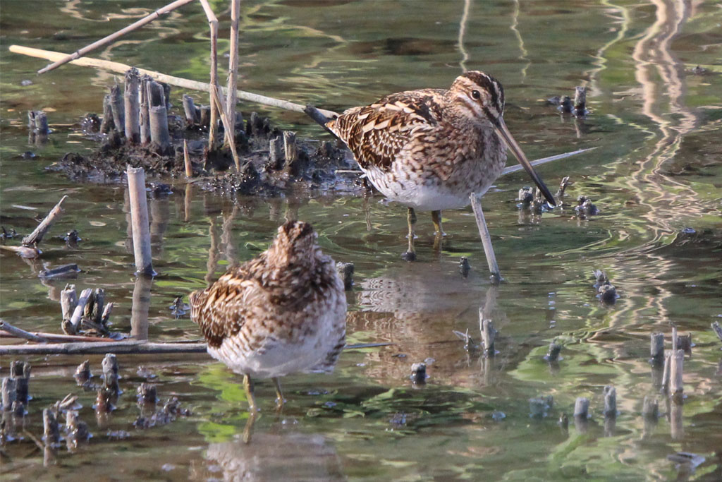 同じくタシギ。シギの仲間の中で唯一、狩猟鳥に指定されています。美味しいかどうかは知りませんけど、丸々と太った姿からは、美味しそうな雰囲気は感じられます。まあ、食べようとは思いませんが。