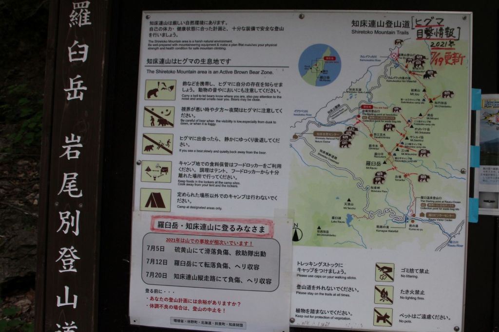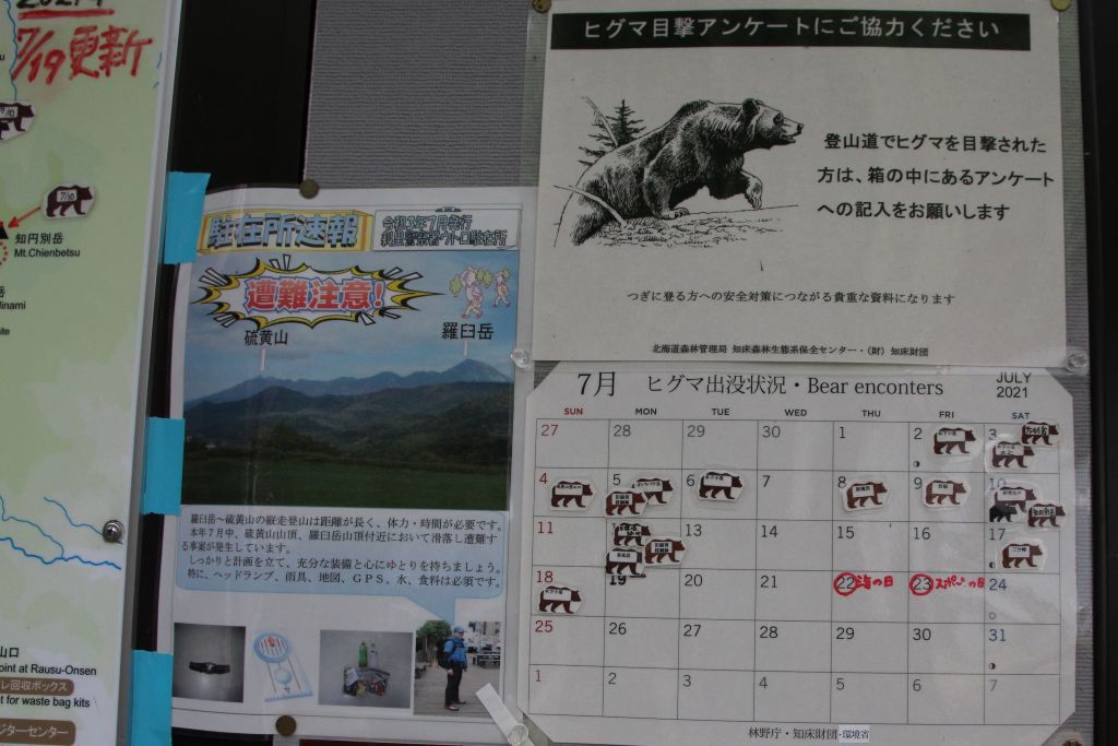 岩尾別温泉木下小屋脇の登山道入口にヒグマ情報が出ていました。