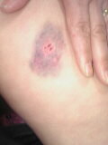 ピ~ンポ~~ンあっ!!玄関でピンポンが鳴ってる!!誰かきたよ!!ワンワンワン!!ハイちゃんは、玄関のピンポンが鳴ると、一目散に猛ダッシュ!!!すごいスピードで走って行くですワン!あっ!!!”””おかぁたんがハイちゃんを差し置いて先に玄関に行こうとしてるですワン!!ハイちゃんが一番に出るんですから、おかぁたん出ちゃダメですワン!よ~し!ジャーンプ!!ガブリーーーーーッッッ!!!わぁぁーーーーーっ!!←母の悲鳴・・・・・・。。。我が家では毎日このような格闘が繰り広げられています・・・。。ピンポンが鳴って、母が出ようとすると、ハイちゃんは自分が先に出たいもんだから、ジャンプして母の足に噛みついて、母の足にプラ~ンとぶら下がります。そしてひるんだスキに、自分が先に玄関に出ます。だから母の足にはこのような生傷がい~~っぱいありますちなみに、ジーパンの上からでもこんなふうに噛みます。そして・・・・・・自分が先に玄関に出たら、気が済むみたいで、ご機嫌で帰ってきます・・・。。エヘン!!ハイちゃん、ちゃ~~んとお客様のお出迎えができるですよ!エライでしょ~~???ウヒョひょひょひょひょひょ~~~~~