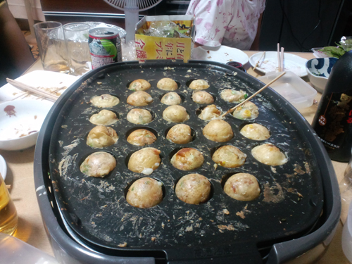 総勢12名。22時頃からたこ焼きっていったい。。。っていうのは置いといて、みんなで準備~!自炊しているという男の子がネギを切ってくれますが、あんた。。。ネギ。。。デカイよまぁ、食べたらおしいから、OKOK!飼い主は「焼き班」。婚活中だという男の子に、「たこ焼きがウマク焼ける男はモテるよ~(?)」とホラを吹きながら、たこ焼きのひっくり返し方をレクチャー最初は、フツーにキレイに作ってたのですが、やはり、、、、最後はごちゃまぜ~~!!なんでもかんでも、あるものを投入っ!!キムチなんか、1パック全部ドバァァァァーーーッ!!!豪快でつ。。。今日も良く食べ、良く遊びました★”おいしかった~