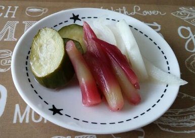 甘酢液が余ったから、同じく京野菜セットに入ってたキュウリと玉ねぎもピクルスにしてみたよ。