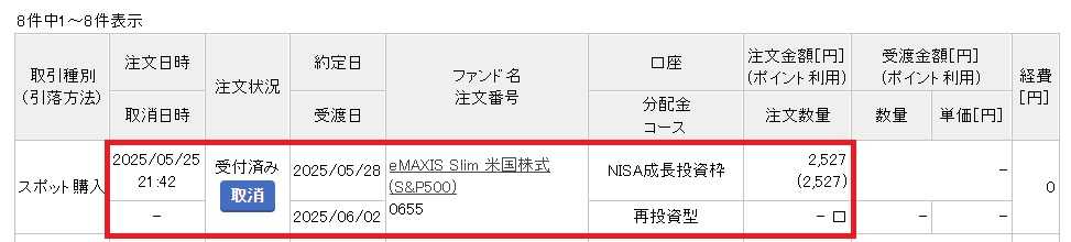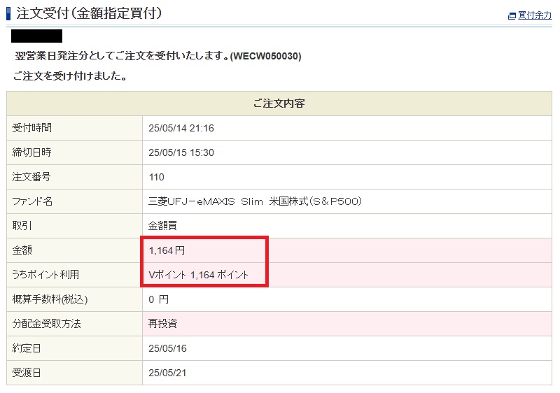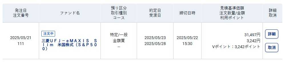 5月も終わりの週に入り、また暑くなってきましたね。先週引いた風邪はすぐに熱が収まったのですが、まだ鼻水が少々出てきます。さて、本日はサブアカウントのVポイントでS&P500を1045円分、買い付け注文を行いました。今月の買い付けはこれで最後となります。月末には、また今月の成績を公開します。投資信託ランキング