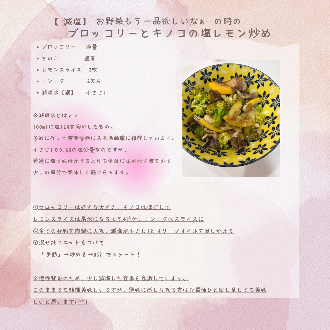ホットクックレシピを紹介しています。私は20代の頃から慢性腎炎で、39歳になって最近数値が少し悪くなってきてしまいました〜( ; ; )ものすごーく落ち込んだけど落ち込んでても仕方ない!今できることを始めよう!最初は徹底的な減塩!!と必死になって減塩…栄養指導に行った先で『頑張っておられますが、きっとこのままではしんどくなって体調を崩してしまうと思いますからぼちぼちとやってくださいね』と言っていただき“ゆったり減塩”に目標を変えました。家にいる時はなるべく薄味の減塩。外食する時はその場を楽しむ!!(やっぱり気にはなりますが( ; ; ))と言うわけで、今回は減塩メニューです。これはニンニクとレモンで風味を出していて、今話題の「減塩水」を使用することで全部1人で食べても塩分量0.6gというスーパー減塩副菜!!お試しあれ❣️(^^)今回はホットクックミニで作っています。ホットクックの大きいので「炒める」をすると、野菜がぐちゃぐちゃになりがちなんですが、ミニだと混ぜ技ユニットが片手なので割と綺麗に仕上がって好きです!【最大10倍ショップポイント★会員優待中】シャープ KN-HW10G-W 自動調理鍋 ホットクック 1.0L ホワイト