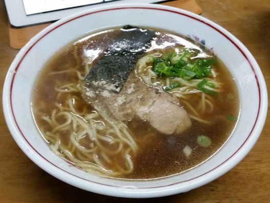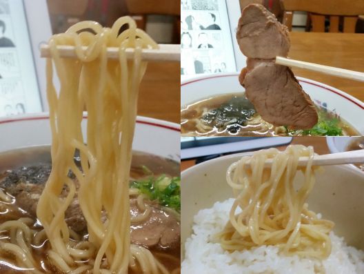 さぁ気になるお味です。。。まず麺は中細で加水やや多めの手もみ風ウェーブ麺、、、ゆで加減はまぁまぁ固めでGOOD!! そしてスープは表面の脂から、おそらく鳥ガラ+魚介(イリコ)系と思われるアッサリ醤油味、、、コレと言った特徴はないものの、ほんのり甘くホッとする食堂系のスープです。。。そしてトッピングはモッチリの"チャーシュー"、"ネギ"、"海苔"のごくシンプル、、、私は麺とご飯を口に含み、アッサリのスープを流し込み一気にいただきます。。。うんうん、旨い旨い~☆