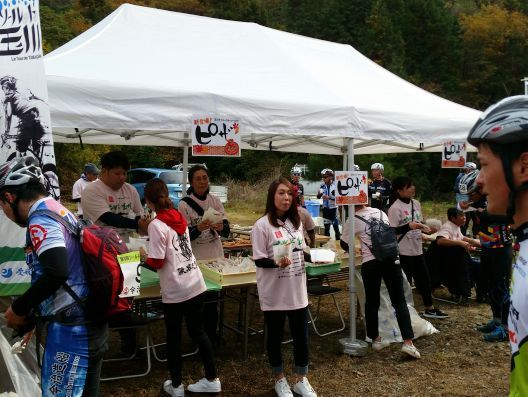 各エイドステーション(AS)では、地域の皆様がその地の特色のあるおもてなしをしてくれます、、、「歌仙の滝駐車場」では、"豚汁"や"プチトマト"です。。。