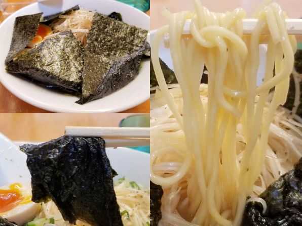 さぁ気になるお味です。。。まず麺はいつもの細目で中加水、手もみ風ウェーブタイプ、、、ゆで加減も固茹ででGOOD!! そしてスープは、デフォの鶏ガラ+魚介(サバぶし・宗田カツオぶし・アジぶし・イワシぶし)なのですが、最初に縁に添えられた海苔を折りたたんでスープに浸します、、、そしてスープでデュルルになったところでいただくのです。。。