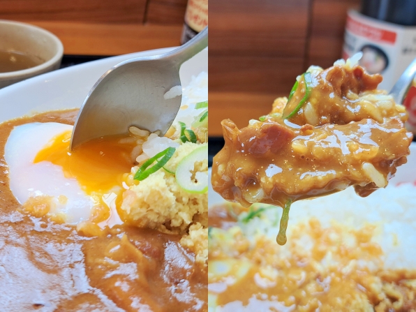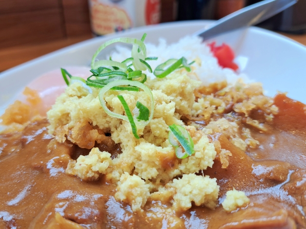 そのカレーに"半熟玉子"をトロつと潰し、生姜をマゼマゼマゼ、、、おおぉぉぉ、とたんにアジアン系のテイストに変わります!! まるで小学生から大人になったように!! 生姜のピリ辛に、天かすのサクサク、ネギの風味。。。うんうん、旨い旨い~☆