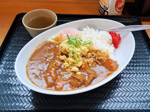 セルフですのでお盆をとって"カレーライス"を大で、、、それに"半熟玉子"をトッピングでお願いしました。。。店員さんに"うどん"は? と聞かれましたが、いりません(笑)、、、代金を払って無料トッピングコーナーへ。。。