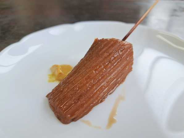 やって来たのは西条市の「 さんぽう 」さん、、、12時40分頃に暖簾をくぐりました。。。お昼時の店内には5、6人のお客さんがいます、、、カウンター席は埋まっていたので、私は4人掛けの席に着き、人気メニューの"たぬききつねうどん"を大盛りでお願いしました。。。また出汁がよく染みて黒くなった"おでん"を一本取って、食べながら待つこと約3分、、、"たぬききつねうどん"のできあがりです。。。