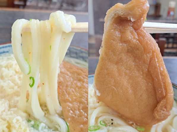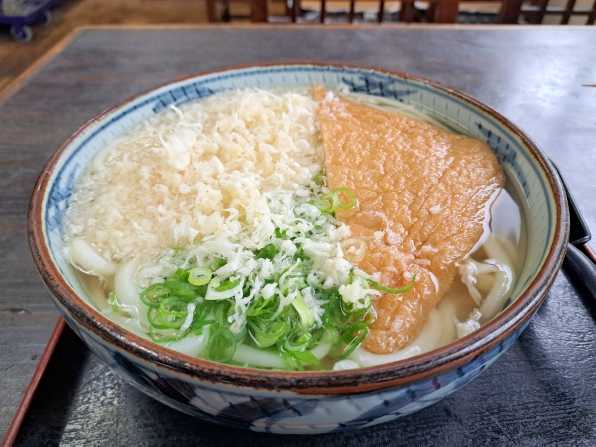 そして出汁はほんのり甘いイリコ系の優しい味、、、またトッピングにはタヌキ(天かす)がタップリ入っていますし、キツネ(揚げ)は大きな丼を半分多う大きさで、ジュワ~っと出汁が溢れます。。。うんうん、旨い旨い~☆