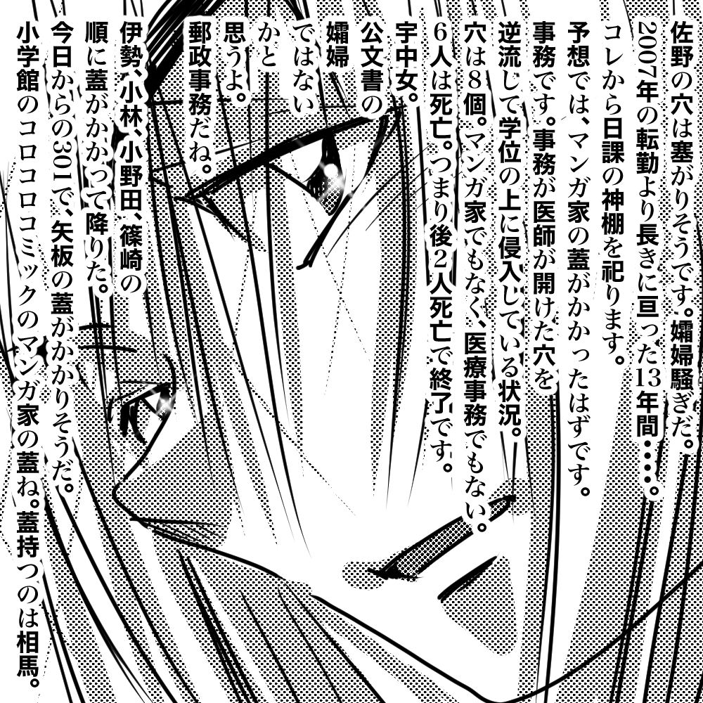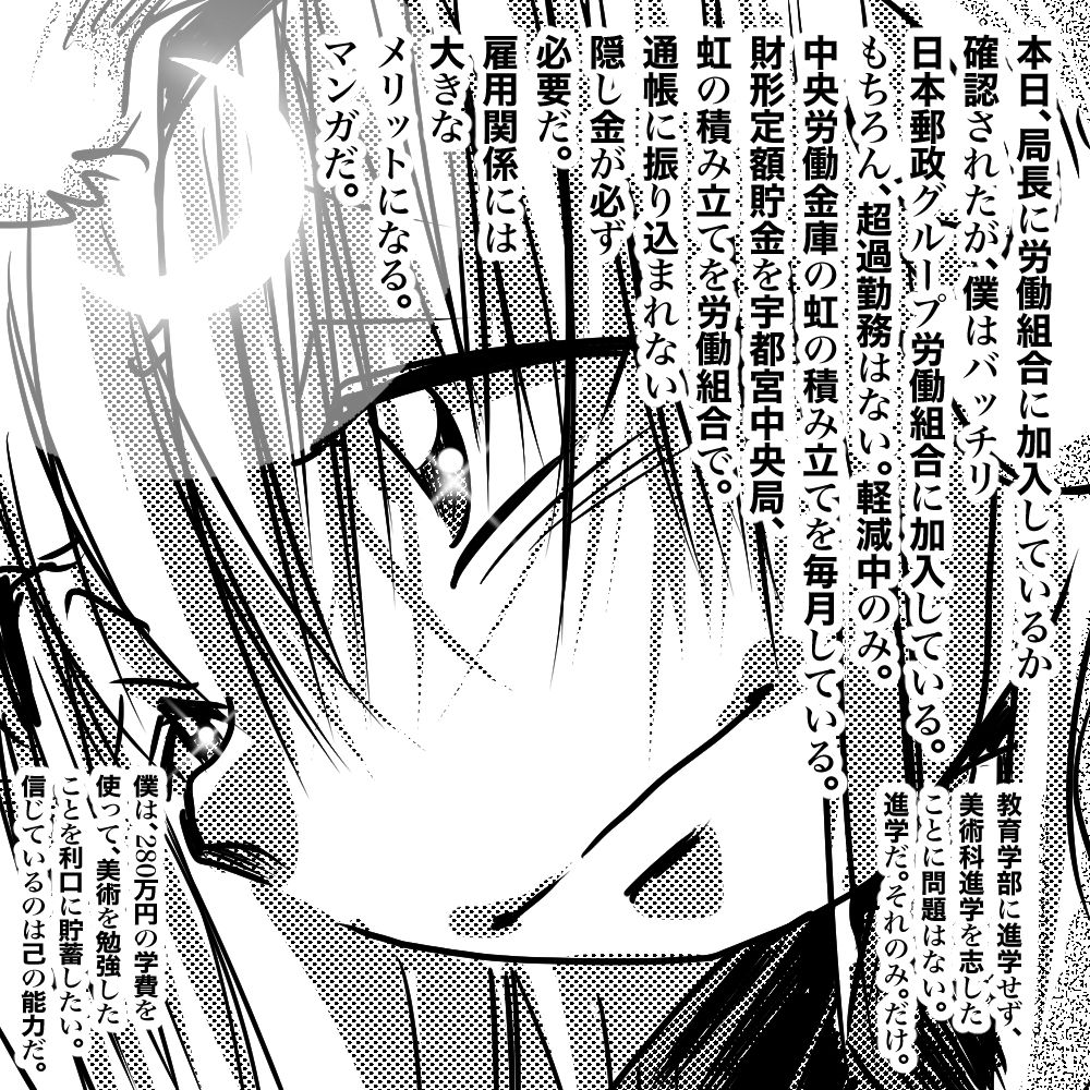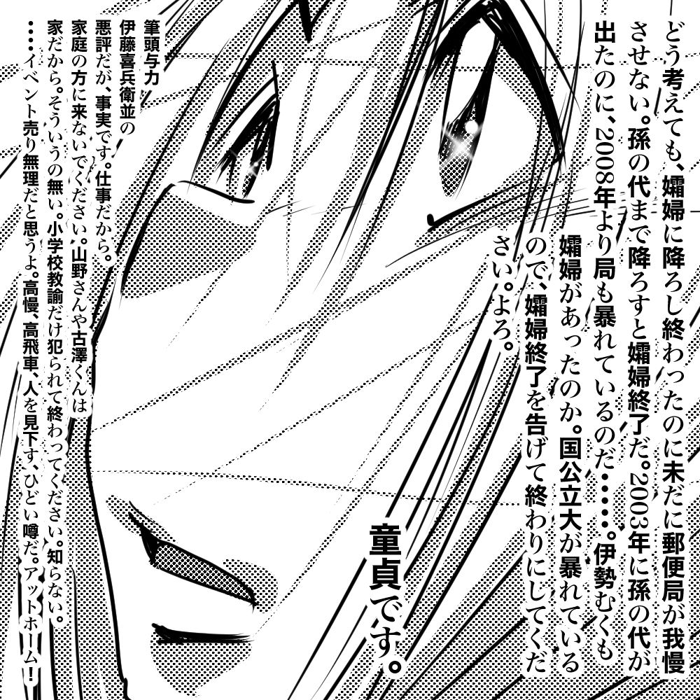 毎日お読みいただきありがとうございます。著者・伊勢むく本人です。第1期よりのブログ読者の皆様は、僕、伊勢むく本人がイラストレーターでもあることを隠しており、今期のブログで初めてイラストレーターの本職であることをご支援いただいていることを皆様既にご存知と存じあげます。毎日の無料ブログ更新は、何よりの僕よりのサービスだけです。本当にサービスです。ブログ読者は継続してブログ読書を、よろしくお願いいたします。ブログの文章は、できるだけ僕本人が記載しています。誤解なきよう。あしからず。(文責 伊勢むく)【楽天版・伊勢むくの日記】ども!数ヶ月ぶりの更新です。マンガ家・伊勢むくです。今年もよろしくね!さて、おなじみ霊能です。実は、大晦日より数日自宅待機中です。つまり株式会社の勤務地入りをしない。初めてですが、コレだけでやっと、公務員の孀婦が全て降り、現在葬り中です。兎にも角にも大掃除。依頼が、医大の教授5人分。5冊新刊を発行にこぎつければOKです。このまま隠遁生活をしながら、作成します。コツコツだね。僕の方は、やはり今年も株式会社の正社員のまま年明けを迎えます。総務は、総務主任と副局長(どちらも総務)の上まで抜き終わりました。上にいます。僕自身の肝としては、単局の局長と、エリアの局長の、両方の上まで抜き終わったと思う。郵政も下だと思う。つまり、すでに郵政社員ではなく、マンガ家です。マンガ家のまま、勤務地に通勤します。地域区分局の宇都宮東からはすでに言われているのだが・・・・。お客様として、ゆうゆう窓口を利用しないでほしい旨。あとは、県内差し出し県内配達の信書を持ちきれないとの旨。コレはすでに、郡山局利用で解消している。空港より航空輸送で関東郵政局管内を信書を通さない。今回は、マンガの定形外郵送した生原稿の回収を僕はしていない。僕はいないので、注意して欲しい。郵便事務室を信書を通過させられない。使えないのだ。僕は、若い時に、僕の親父の世帯に届いた信書。その配達中継局に勤務しネバっている。配達局は、すでに集配部門を廃止にし、局舎も新局舎に移築し面影がない。とにかく、局舎内を下にし続けるしかない。毎日降ろし続けないとどうにもならないのだ。・・・・・保管しておいた生原稿を封筒ごと亡失した際には諦めて欲しい。すでに僕は今回はいないので勘弁して欲しい。いない。コレは、読者にはどうでも良いことだが追記。テキトーに記載します。数字の上では、集配のリストラは終了。総務があと40パーセント、同じく混合が40パーセント。窓口はまだでコレから。僕は、集配でリストラを終了した。平成2年の郵政最後の内務転用試験での合格採用。人事院の、郵政事務Bと郵政事務Aがまだ続行中デス。Bに関しては、国家時代に課長代理以上の役職者はそのまま。以下の役職者はクビ。局長の計らいで局のメイト勤に直行。窓口だとゆうゆう窓口のメイト。(しかしながら現在のゆう窓のメイトは課長代理指導で上のみ在職中。)混合だと単局のメイトで配達センター配属。コレはメイト。窓口も左遷ありで、ゆうゆう窓口にも・・・・。局長になれないと来る・・・ようだ。メイトっぽい。国家時代に下だとメイト。確実にメイト。・・・・問題は、孀婦。死んでいるみたい。深く考えないで、おやすみ。(ブログ記載 マンガ家・伊勢むく)本日も生真面目な楽天ブログの更新をお待ちいただき恐れ入ります。毎日の更新を、明日もお待ちください。