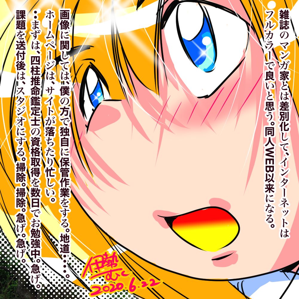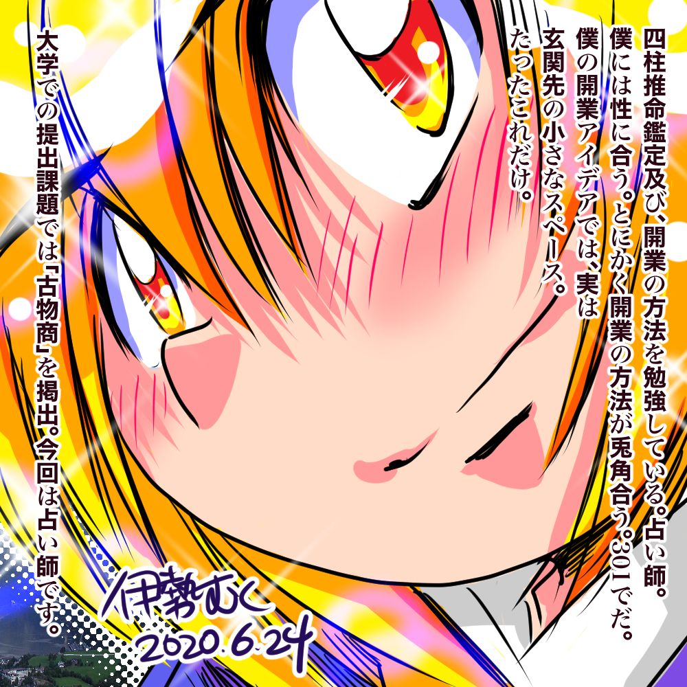 毎日お読みいただきありがとうございます。著者・伊勢むく本人です。第1期よりのブログ読者の皆様は、僕、伊勢むく本人がイラストレーターでもあることを隠しており、今期のブログで初めてイラストレーターの本職であることをご支援いただいていることを皆様既にご存知と存じあげます。毎日の無料ブログ更新は、何よりの僕よりのサービスだけです。本当にサービスです。ブログ読者は継続してブログ読書を、よろしくお願いいたします。ブログの文章は、できるだけ僕本人が記載しています。誤解なきよう。あしからず。(文責 伊勢むく)【楽天版・マンガ伊勢むくの日記】来年より霊能力者として開業しそうだ。マンガ家・伊勢むくです。マンガが有った方がしっくりくる。やはりマンガだ。掲載します。今日よりフルカラー。若い時よりも、僕自身の実力は圧倒的に開花した。しかしながらイベント参加は控える。自宅の自室での執筆作業。そしてできればその自室での掲載。昔と違って、WEB掲載で問題ない時代だ。やはり独自ドメインを取得しておいてよかった。自身の試算で、少なくとも定年退職までの、我が桃芸社の備品は揃った。後は地道な執筆作業。また、まだまだ必要な登記登録と勉強がある。まだ必要だ。かなり厳しい。すでに生存競争になりつつある。35歳までの知り合いの全てが、僕よりも若い他界になった。僕は一番長生きするようだ。そうなると、先立つものは「カネ」。なんとかして資金を得たい。少しでも賃金対価があるモノはより圧倒的に形を変え使う。座る時間を大切にしたい。(ブログ記載 マンガ家・伊勢むく)本日も生真面目な楽天ブログの更新をお待ちいただき恐れ入ります。毎日の更新を、明日もお待ちください。