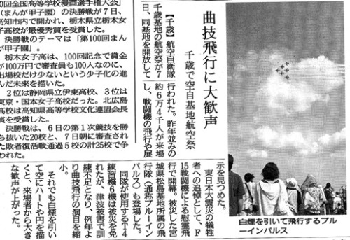 2011.8.8 北海道新聞紙面より引用訓練不足で水平系の演技のみであることはネット上での噂どおり。今回、オレが出撃をパスしたのは前日までに雲の様子が読み切れなかったのと真夏日の暑さに怯んだため。
