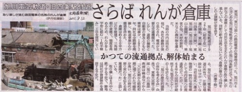 東旭川、東川方面への路面電車の発着点だった、旭川市4の18にある旭川電気軌道のかつての旭川四条駅付近で、米や石炭などの倉庫として市民生活を支えたれんが倉庫の取り壊しが進んでいる。同駅の駅舎は既にないため、倉庫の撤去で当時をしのぶ建物が姿を消す。以上、北海道新聞 2011.8.12 より引用