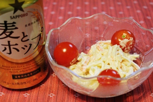 今日の肴は大根なますのマヨネーズ和え。オレも妻も酢の物はあまり得意じゃないのに、実家の母が「なますいっぱい作ったからもってきなさい」って。そのままじゃ肴にならないから、マヨネーズで和えてみた。