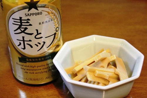 今日の肴はメンマ。市販のものではなく、タケノコの水煮を味付けしたもの。
