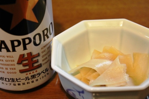 今日の肴はガリ。生姜の甘酢漬けね。市販品ではなく、妻が数年前に作って熟成(?)させていたもの。久しぶりに引っ張り出してみたのだが、酢が飛んだのかやたらと辛い。