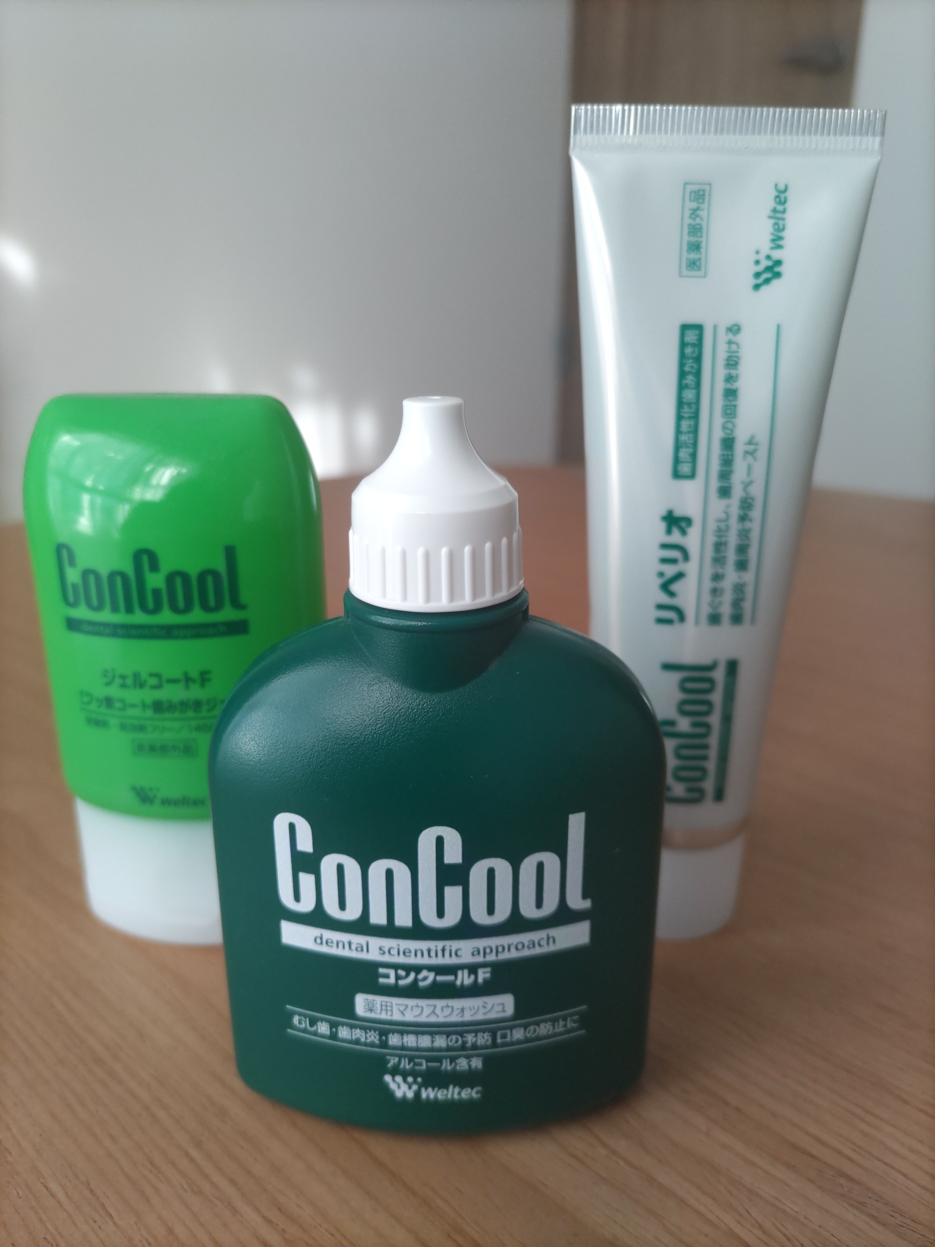 声を大にして言いたい…虫歯も怖いけど、歯周病がとんでもない悪者であることを。グラグラする音が頭に響く昨年夏のお盆に帰省した際、多忙が続いたのと新しい歯ブラシが合わなかったのか歯周病が悪化してしまった。自宅に戻った頃には音が響いてくるほどグラグラしてしていたので、「あぁ、ついに失うのか…」と完全に諦めていた。しかし、歯科医院では私の歯を残したい気持ちを配慮していつか失う日はくるでしょうが、まず治療してみましょうと言ってくれた。真剣にケアに取り組む歯科医院に行けば、高い確率で紹介されているConCoolシリーズ。ただそれだけの理由だけど、藁にもすがる思いで購入。薄緑のConCoolはゆるい無色のジェル状。爽やかで使いやすいので、食後に「ん、ちょいキレイにしときたい」って時に使ってます。寝る前やしっかりケアする時はチューブ型のリペリオ。ちょっと塩味しますが、ジェルと違って白いペースト状なので歯ブラシに乗せやすく、歯にもしっかり着いてくれている気がします。最後に濃緑のConCool、マウスリンスと言うんでしょうか。希釈するタイプなので、「めんどくさいな」と思う方もいるかもしれません。でもこれ、何だか…歯医者さんとこで知ってる味のような気がする…??とにかく、仕上げに使うことでめっちゃ安心感があります。※ちなみに、歯ブラシ以外にフロスも使ってます。 フロスの後に、このゴム状の歯間ブラシ。 カーブしていて使いやすい。グラグラしなくなった!!!!使うこと1週間ほど。頭に響いていた音が無くなった!!歯科医院の先生にも「このまま様子みましょう〜」と言ってもらえ、2ヶ月おきに受診しして現在に至る…。根本的に、歯周病が無くなった訳ではないので、いつかは、失う日はくるのかな…周囲の歯に影響もきてしまうらしいので、早めの決断が必要なのかも…こんな私のような状態になる前に!歯の健康を守ってくださいねー!ConCool三兄弟、ドラッグストアで見ることもあるんですが、楽天でお得に見つけました!私も次回から楽天で買います✊【宅配便本州送料無料】コンクールF 100ml ジェルコートF 90g リぺリオ 80g 3点セット ウェルテックConCool北海道・四国・九州行きは追加送料220円。con【対象商品PT10倍開催中】 ウェルテック コンクール リペリオ 80g 3個セット 【送料無料】【最安値挑戦中】ガム(G・U・M) 歯周プロケア ソフトピック カーブ型30P サイズSSS-S(30本入*3個セット)【ガム(G・U・M)】[やわらか 歯間ブラシ sss ゴム ラバー ようじ ピック]