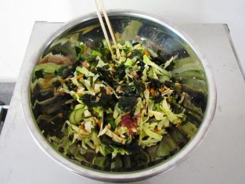 おはようございます。今日は 晴れのち曇り 予報気温は13度 少しずつ暖かくなっているようです。 今日も車で200キロ移動 昨日に続き 今朝も7時にホテルを出ます。でも 今日は助っ人が来ていますので 私は助手席で・・(^_^メ)画像は 最近のサラダ・・・いつもの食材に 新しいものが 加わりました。なんだかわかりますか・・?それは 下の画像 一つまみ・・いや 二つまみぐらいかな 冷水に 浸けること約10分きざんだ キャベツ・キューリ・ニンジン・ピーマンそして シーチキンに 入れて ノンオイルの 青シソドレッシングを かけて 作りました。 ワカメは 結構歯ごたえありますね。よく噛むため・・あご疲れます。(^_^メ)