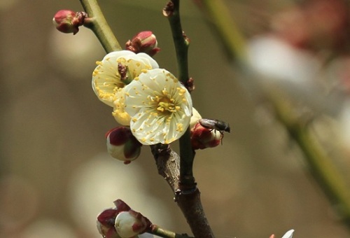 おはようございます。今朝も霧が出ています。昨日ほどではありませんが・・。天気予報で 今日は冷え込むとか・・少し着こんできましたら・・背中が汗ばんできました・・今 体は暖かい・・。昨日あたりから なんとなく風邪っぽい・・今朝はあまりひどくなっていない・・大丈夫かな?今週半ばから 出張・・風邪ひけません・・。画像は 先日の梅・・よく見ると 虫が・・メジロがいないので 虫狙いにやはりミツバチですよね・・でも これは似合いませんよね(+o+)ハエだと思うのですが・・・私がフランス料理食べるようなものです。