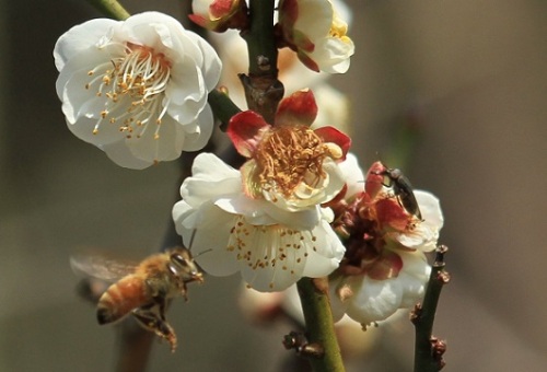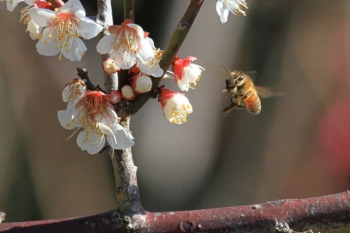 おはようございます。今朝はグッと冷え込んでいます。防寒対策で着こんで家を出てきました。珍しく 水たまりには 薄氷が張っています。このところ風邪かな?と思っていたら ひどくもなってこない・・やはり花粉がやってきました・・連日鼻水・・でも 例年に比べ ひどくはなっていないです。しばらくは 我慢してお付き合いです。画像は 梅園の続きミツバチの飛ぶ姿は可愛いですね。色はグリーンでキレイですが・・どうも ハエ のイメージが強い
