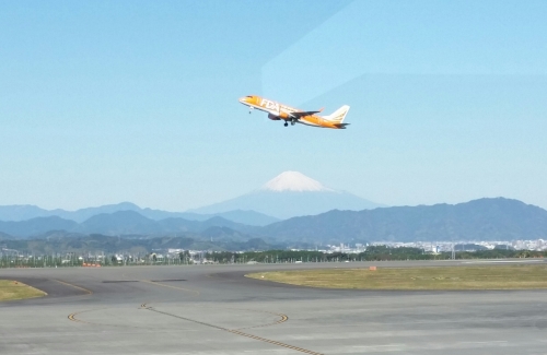 おはようございます。昨日飛行機で福岡に来ました。小雨で寒いです。今朝も雨。昨日はタイミングが悪く乗り継ぎのバスや電車 ことごとく1分間に合わなくて乗り遅れ 飛行機には間に合いましたが飛行機も 福岡空港着陸寸前で滑走路閉鎖・・・・前の飛行機が滑走路で鳥を吸い込んだとかで 鳥を排除する作業の為だとか。画像はスマホで取りました。静岡空港で。うまく富士山と飛行機が入りました。