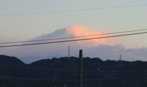 おはようございます。今朝も気持ちよく晴れています。風も感じず冷え込んだ朝です。畑には霜が降りているのでしょう 少し白くなっています。池には薄氷ががっています。 氷の破片をもって通学する小学生の男の子が印象的です。画像は また富士山 ですみません。 朝日が当たっています。 周りの雲にも朝日が色を付けています。