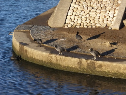 おはようございます。今朝も晴れています。朝日が出始めているのか 空がうすくオレンジ色になって居る部分があり 太陽が昇る位置がわかります。休みに入って続いているウォーキング 連日1万歩超え 途中で走るので 太ももの筋肉がパンパンに張っていて 昨日は走るのがつらかった・・・おまけに向かい風・・でも15000歩歩きました。今日もこれから歩きに行ってきます。いつも歩くコースは 巴川をぐるっと回るコース約6000歩久しぶりに この川を見ながら歩きました。毎年来る オオバン 住み着いたオオバンと この子たちが たくさん来ていました。歩きながら数えると40羽はいます。何か白いものを加えています・・・最初は大きなくちばし・・と思っていましたが なんでしょうね・・これを取に来るほかのオオバンと 喧嘩していました。
