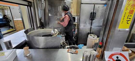 静岡駅 ホームにある 「富士見そば」 年配の 女性が 手際よく作っています。