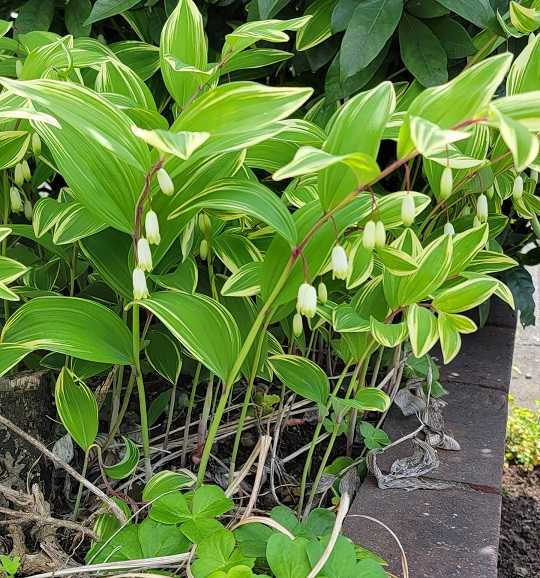 そして 花壇の 大きな葉っぱの下では アマドコロも咲き始めています。
