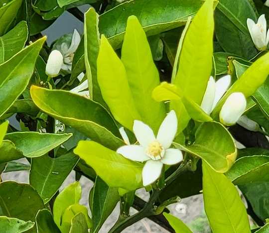 ところどころに ミカンを植えてあり 白い花が咲いています。