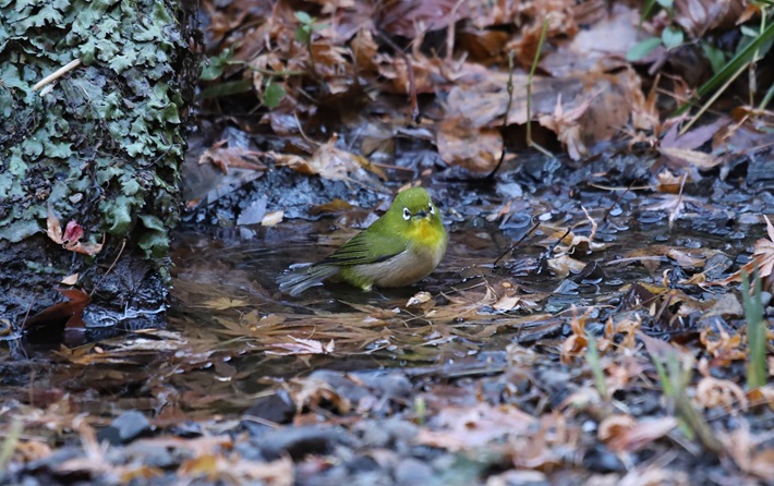 後ろを向くと メジロが・・この寒さの中・・水浴び・・。
