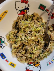 中に詰める具材は大目に 余った具材はそのまま炒める。そして ちくわにも 詰める 餃子も これが我が家の 土曜のランチ