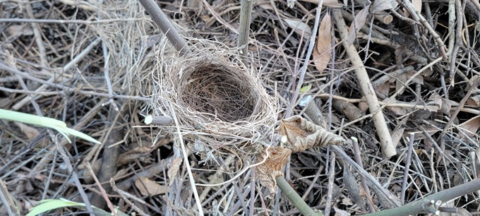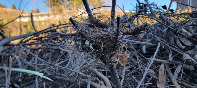今いる現場の 雑木が邪魔なので 切りました・・よく見ると 野鳥の巣が・・余分な枝は伐採しましたが この巣は 壊せない・・残しました。