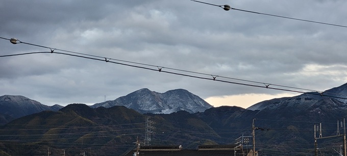 我が家の ベランダから 北西の山を見ると うっすらと 雪化粧 この時期にしか積もりませんが・・すぐ融けるでしょう。
