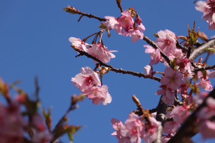 画像は 17日 塩田川の土手を 歩きます。まだ散らない 河津桜 青空をバックに 撮ってみました。