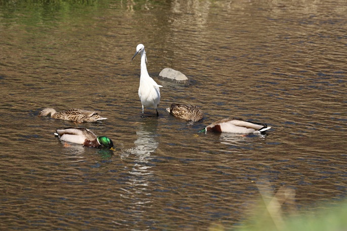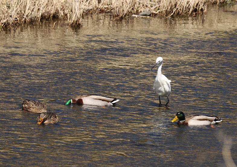 川の中に目をやると コサギと 鴨さん家族が 仲良くしています。