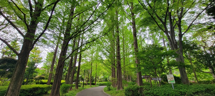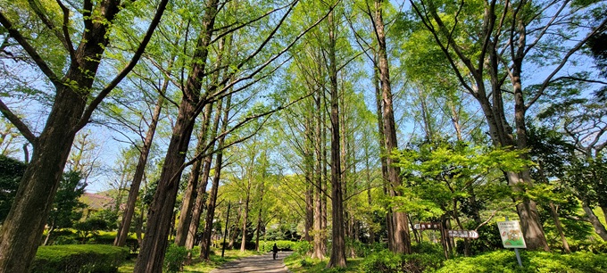 画像は4/28 城北公園 メタセコイヤの通り 10日前と比べ 若葉が増えました。