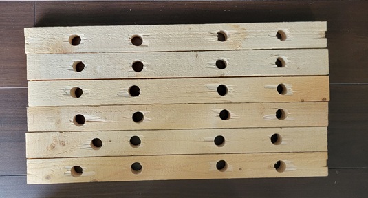 横幅50センチほどの 薪に 穴をあけました。  これの方が 燃えやすい・・薪は ご近所の 工場の廃材 昨年もらったものが余っていたので 今年もそれを使うことに・・穴をあけると 火の回りが早い。