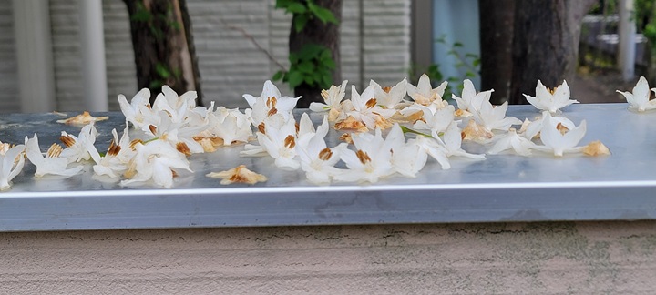 スマホで 縦で撮りました。 手すりに 花弁が落ちています。