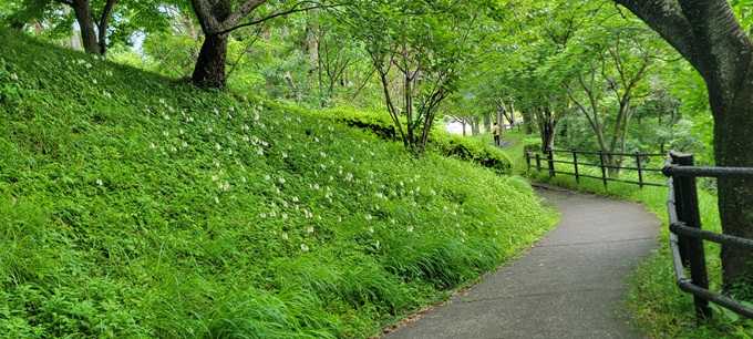 こんな感じで 登ってきます。  奥に人がいますが あそこの左側が 裏からの入口  そして この場所は 下の駐車場から比べると 60メートル 高いようです。  歩くだけで 良い運動になります。