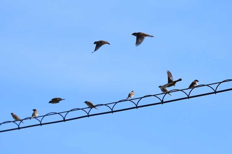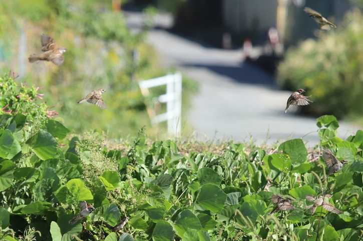 こちらは 草むら・・沢山のスズメが あわただしく 飛び回っています。
