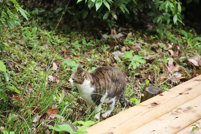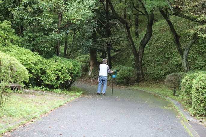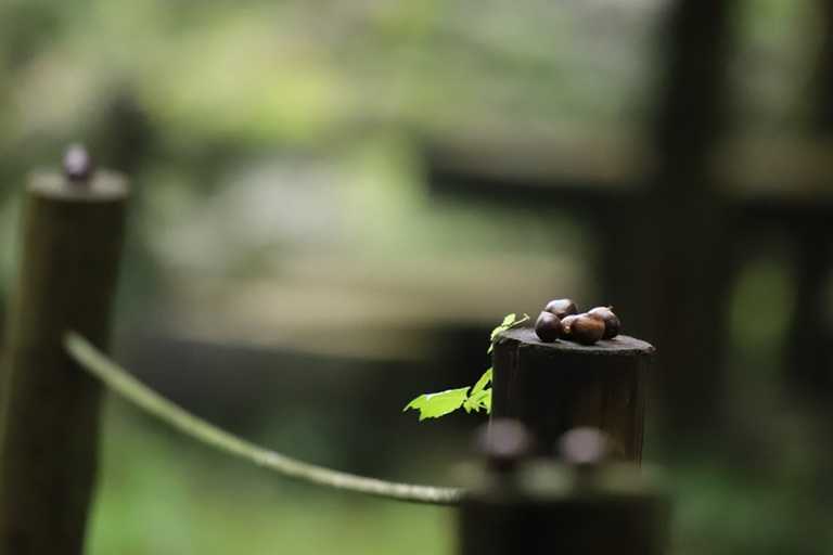 通路に 木製の杭 その上に 誰かが クリを置いてあります。  近くに栗の木がありますので 拾って並べたのでしょう。