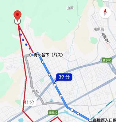 画像の 青いラインが バスの 運行線  突き当りの 梅ケ谷下 で降りて歩きます。  約1万歩は ずるしました。