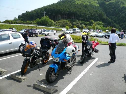 今日は板のツーで河口湖へ行ってきました。参加者 ふたつきさん@CBR600 甜さん@ビュエル 秋姫@CB400集合は私の地元相模原の地元のエッソのGS。ここは相模原警察そばで、ドトール併設です。集合は8時なので7時35分到着。ふたつきさんはすでに到着で、給油中でした。私も給油し、二人でコーヒーと簡単に朝食。8時過ぎても甜さんと秋姫が来ない。そこへまだ来ぬ2人からふたつきさんに電話。警察のそばのドトールのあるエッソにいるとのこと。何故合えぬ!よくよく考えると、ここより横浜よりに相模原南署があり、そばにドトールのあるエッソもある。2人はそこで待っていました。てなわけで真の集合場所に移動してもらい挨拶もそこそこに宮が瀬に向けて出発。私の地元ということで宮が瀬まで先導しました。 道志をとおり道の駅まで。結構車が多い。順法走行で道の駅到着。相変わらず今日も駐車場はバイクだらけ。私はここで早めにお土産を買っておいた。 道の駅から少々逆送し道坂峠へ。フリー走行で快適に走ったが、この方向で走るのは今日が初めてでした。道坂峠の秋姫↓ ふたつきさん↓ 都留に出て、渋滞の酷道を目指すパスタ屋さんへ。予約してあったのですぐ席につけた。パスタコースをたのみ、食前にノンアルコールビールを一口。アルコール無しでもビールと名の付くものは旨い。 食後山中湖から明神三国峠へ。甜さんの後に付いていくが段々離されてします。後ろで見ていると、S字の2個目の入り口で後輪がスライドしてる。付いていくのをあきらめマイペース走行。甜さん、いい根性してますね。R246で大井松田まで走り、東名で緑青葉インターまで。厚木インターあたりでバイクとワンボックスの事故のため渋滞していた。すり抜けしていてワンボックスの横腹に接触したみたい。注意!注意!といいながらすり抜けで海老名SAへ。ここでみんなで休憩していると、秋姫のもとへ男が近寄ってきた。ナンパか?よく聞くとバイク雑誌の記者で女性ライダーにインタビュウしているって。秋姫は快く受けておりました。来月の24日だか26日に雑誌が出るって。インタビューを受ける秋姫↓ ウダウダした後、ふたつきさんのなじみのお店でコーヒータイム。コーヒーを飲み始めたころ初めましてのひーさん登場。今日大型免許を奪取したとのこと。おめでとうございます。みんなで早く大型買いなとけしかけるが、さてどうなることやら。
