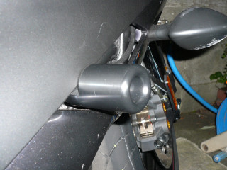 先人は良く言ったもんです。こんなもん付けました。 安もんですが、カウルに加工無しで付けられました。見てくれより機能重視です。ついでにバンクセンサーも取りました。 無理にこんなところから折らなくてもよいのですが、わけがありまして。私の場合こかした後のフレームスライダー でした。ODは180kmを指していました。