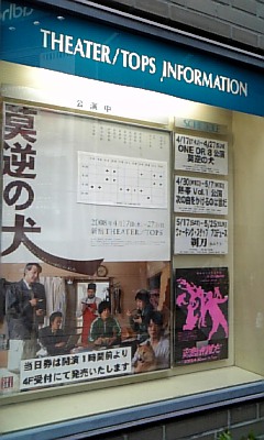 ココリコの田中直樹の初舞台。「莫逆」とは極めて親密な関係のことで、このタイトルは、劇中、外出できない男を「室内犬」に例えたことから付いたものです。ある事件をきっかけに,彼女のアパートにかくまわれ、そのアパートから一歩も出ない男の10年間を描く。舞台上、次々に月日が経っていき、登場人物たちの周囲も移り変わるが、アパートの一室でその男の世界は変わらない、静かな狂気。展開としては、きわめて当たり前な方向に進み、端々に小さな変化があるものの、意外な出来事も起きないまま追い詰められていく日々。彼女にとっては忘れるほどの小さな日常も、男にとってはそれこそが数々の思い出だといい、また、アパートの前の桜の木を、一度、外で下から見上げたかった…というのも哀しい。 和田ひろこ以外の登場人物には,何処か嫌なところがあるのは、狙いかどうか気になるところでした。ONEOR8 新作公演「莫逆の犬」(ばくぎゃくのいぬ)2008年4月17日(木)~27日(日) 新宿THEATER/TOPS 公式: http://oneor8.com/作・演出: 田村孝裕出演: 田中直樹(ココリコ)/野本光一郎・恩田隆一・和田ひろこ・冨田直美・冨塚智・平野圭・伊藤俊輔/関川太郎/小林隆☆