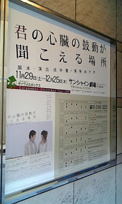 メリー☆クリスマス♪恒例のキャラメルボックス2008☆クリスマスツアー。クリスマス前なのに、相変わらず忙しいTVシナリオ作家の前に、突然14年前に別れた娘が現れた。作家志望という彼女の行動が何かおかしいが・・・。ゲストに黒川智花を迎えて繰り広げられる、キャラメルならではのハートウォーミングストーリー。西川さんが話す娘の思い出と再会に涙;;)悪役?も登場せず、クリスマスらしいお話でした。▽▽▽▽▽以下ネタバレがあります。▽▽▽▽▽▽▽サンシャイン劇場地上の看板プレゼントの抽選会で、あめをもらいました。普通のお話のパターンだと、娘さんが亡くなった直後に会いに来て、果たせなかった望みを果たして、天に召される(成仏?)というところですが、クリスマスだし、無事ハッピーエンドでひと安心。ホラー的な表現だと、生霊ということですかね。瞳キラキラの黒川智花さんは、やはりかわいらしくて、西川パパは、14年ぶりの再会なのに、なぜにああも、つめたいのか?かわいそうでしょう。まぁ会わせる顔が無かったのかもしれませんが。最近もう少し長くダンスが観たい!と思ってます。渋谷センター街(23日)━━━━━━━━━━━━━━━━━━━━━━━━━━━◆◇◆演劇集団キャラメルボックス2008クリスマスツアー◇◆◆君の心臓の鼓動が聞こえる場所◆◇★2008年11月29日(土)~12月25日(木)http://www.caramelbox.com/━━━━━━━━━━━━━━━━━━━━━━━━━━━脚本・演出:成井豊+真柴あずきCAST:黒川智花 西川浩幸 大森美紀子 岡田さつき菅野良一 大内厚雄 前田綾 岡内美喜子 温井摩耶三浦剛 筒井俊作 實川貴美子 阿部丈二原作:君の心臓の鼓動が聞こえる場所☆人気ブログランキングへ☆↑ランキングに参加してます。↑よろしければ1クリック投票いただけると嬉しいです。m(_ _)m