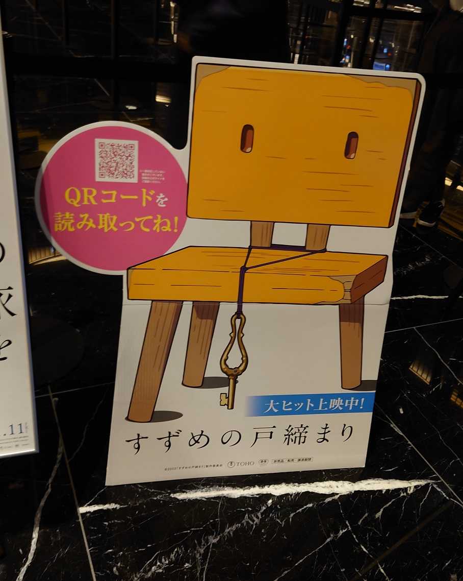 劇場販売グッズ『すずめの戸締まり』チャームマスコット すずめの椅子公開初日にしてTOHOシネマズ渋谷、新宿で早くも品切れ(もしくは販売無し?)2022.11.11.新宿ピカデリー「チャームマスコット すずめの椅子」を探し求めて、TOHOシネマズ渋谷、TOHOシネマズ新宿へ。しかし、公開初日にして、早くも品切れ?(もしくは販売無し?)新宿ピカデリーで発見!ゲット!「椅子の脚が1本ありませんが、デザインであり、不良ではありません。」という注意書きは…ありません。【先着特典】すずめの戸締まり(CDサイズカード絵柄D) [ RADWIMPS/陣内一真 ]価格:3300円(税込、送料無料) (2022/11/11時点)楽天で購入すずめの戸締まり (角川つばさ文庫) [ 新海 誠 ]価格:924円(税込、送料無料) (2022/11/12時点)楽天で購入すずめの戸締まり (角川つばさ文庫) [ 新海 誠 ]価格:924円(税込、送料無料) (2022/11/12時点)楽天で購入小説すずめの戸締まり/新海誠【1000円以上送料無料】価格:748円(税込、送料別) (2022/11/12時点)楽天で購入人気ブログランキングへ ・